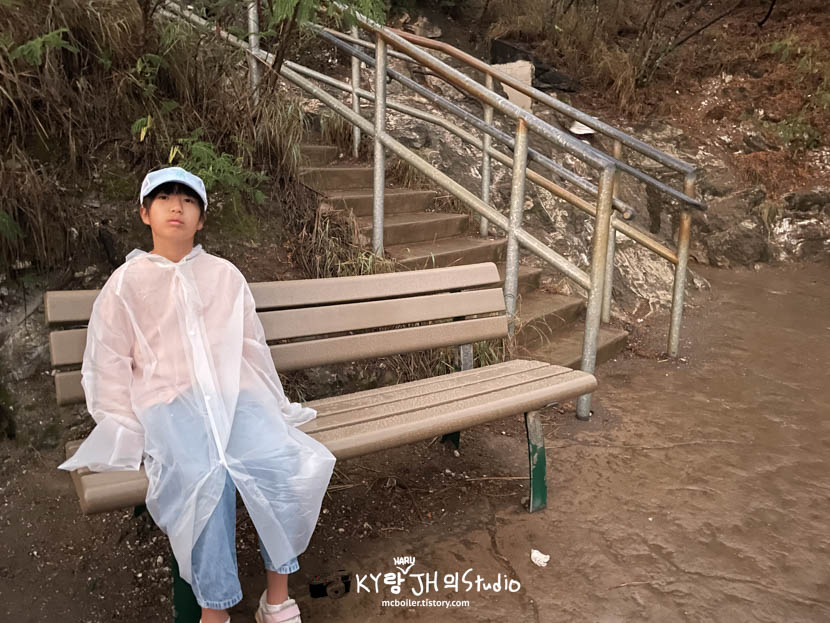 딸아이는 졸린데 비까지 내리고 원래부터 이런 활동을 좋아하지도 않아서 점점 기분이 안 좋아져서 걸음도 무거워지고... 결국에는 '기분이 안 좋아'라며 발걸음이 멈춰 버렸습니다. 저희 뒤에서 오시는 분들에게 방해가 되어서 아빠가 업고 올라가기!😳 아빠는 허리가 안 좋기에 걱정이었습니다.😟