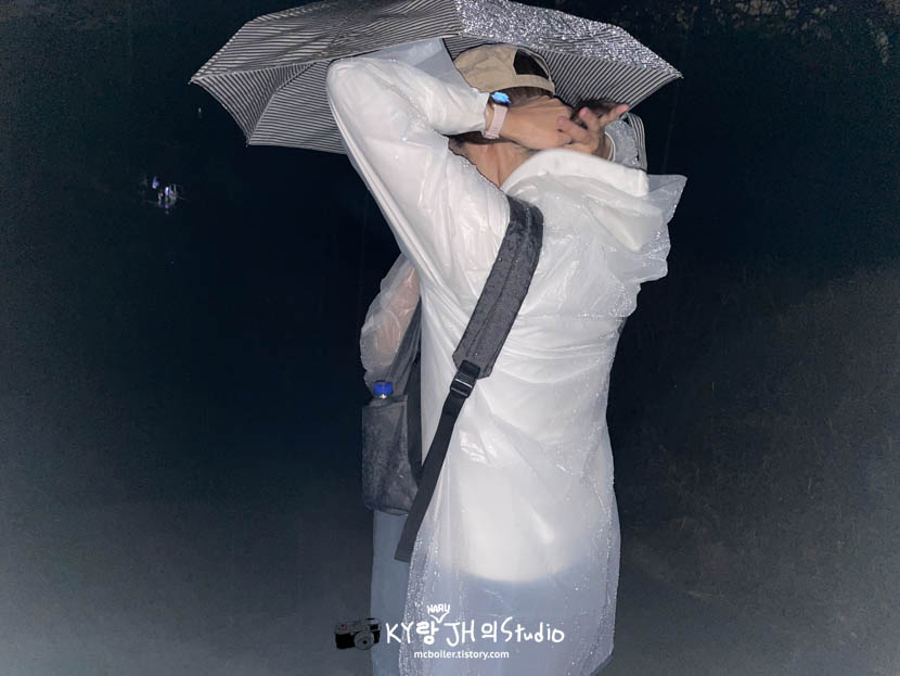 비는 그칠 생각 없이 점점 더 강해졌기에 만약을 위해 가져 온 우비를 꺼내 입고 올라가기로 했습니다. 방한도 외었기에 우비를 가져오길 정말로 잘했습니다 (졸려서 기분이 다운된 딸아이💦)