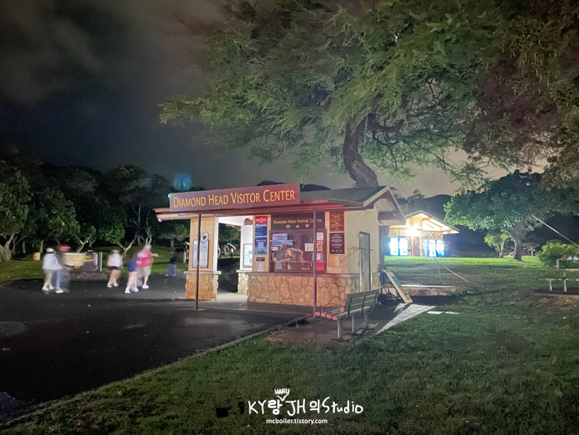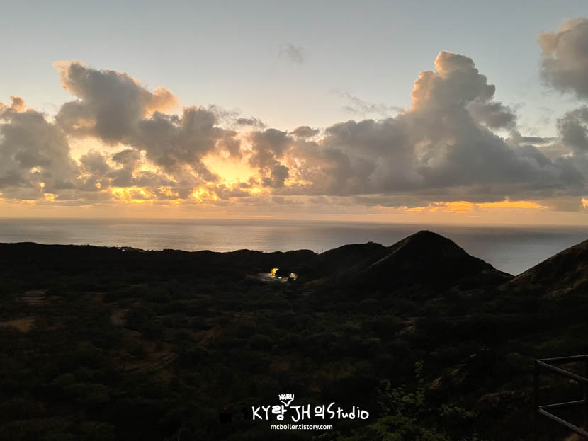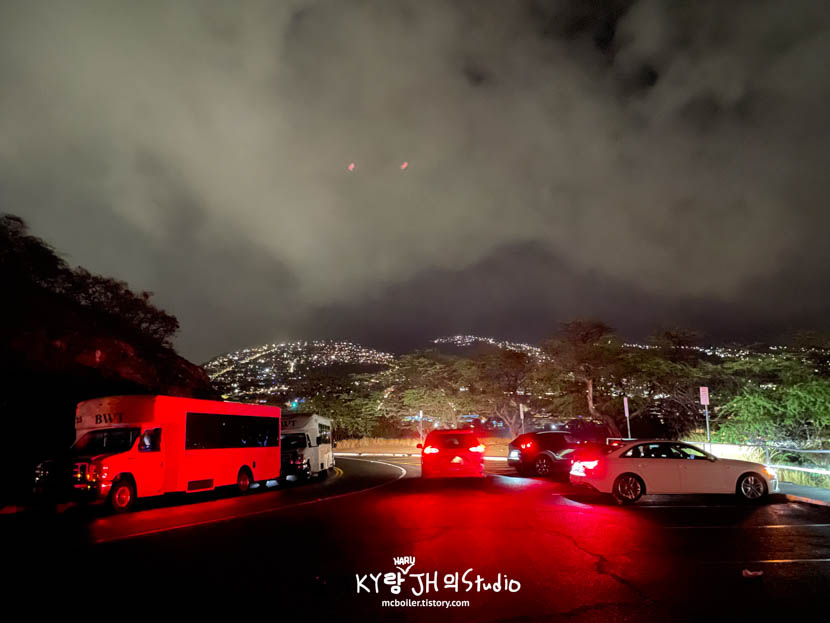 다이아몬드 헤드의 등산로 입구까지 차로 가려면 렌터카로 가서 주차장에 세우던가 트롤리를 타고 가야 합니다. 택시를 타고 가면 등산로 입구 앞에 있는 '카할라 룩아웃'이라는 곳에 내려서 10분 정도 걸어야 합니다. 전망대여서 낮시간에는 한적한 고급 주택가인 카할라 지역의 파노라마 뷰를 즐길 수 있을 것 같은데 아직 깜깜해서 아무것도 안보였습니다. 😅