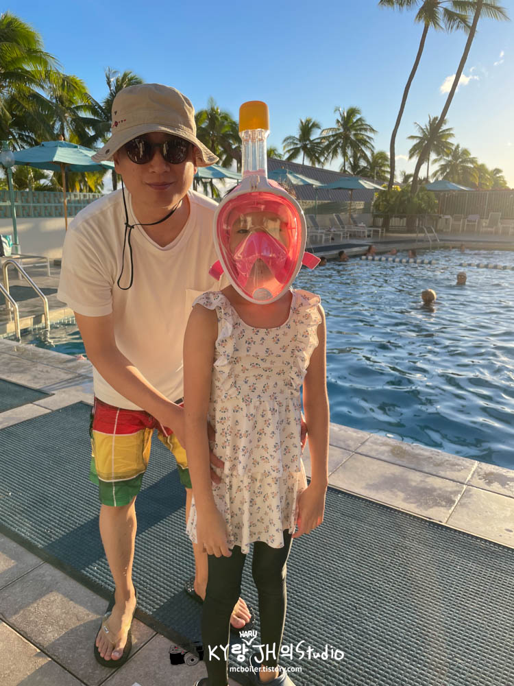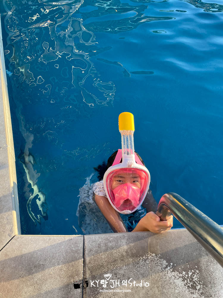 호텔로 돌아가기 전에 따뜻한 수영장에 들어가고 싶다고 해서 일본에서 가져온 풀 페이스 스노켈링 마스크를 장착🤭