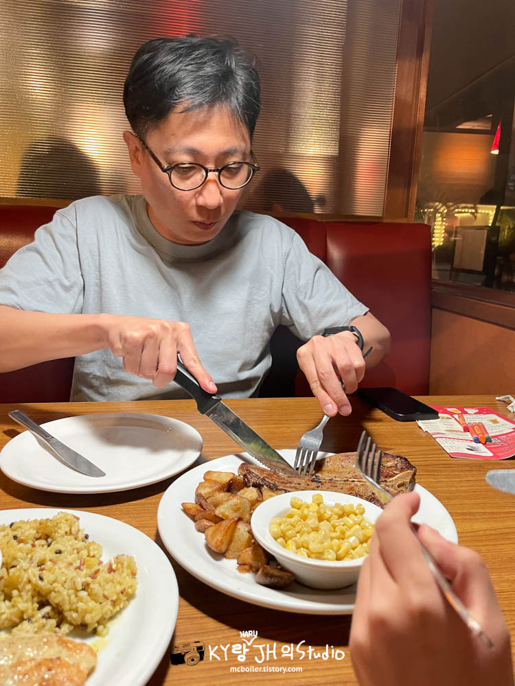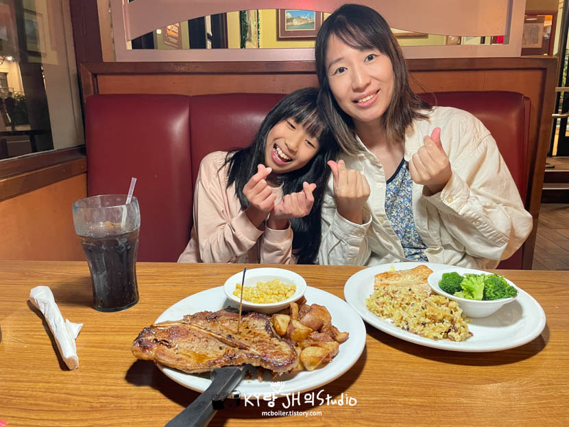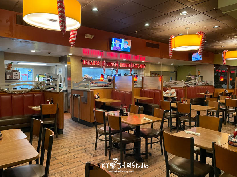 그중에 유일하게 비어 있던 Denny's. '여기까지 와서 체인점은 아니지'라고 생각해서 처음에는 바로 지나쳤지만 어디를 가도 들어갈 수가 없어서 결국 타협하고 다시 돌아와서 안으로 들어갔습니다 만! "주문하고 음식은 40분 정도 걸려"라고 했습니다. 이렇게 가게 안이 텅텅 비어있는데??라고 생각 했지만 다른 가게를 찾으러 다시 나가도 시간만 아까울 거 같아서 OK라고 자리에 앉았습니다.