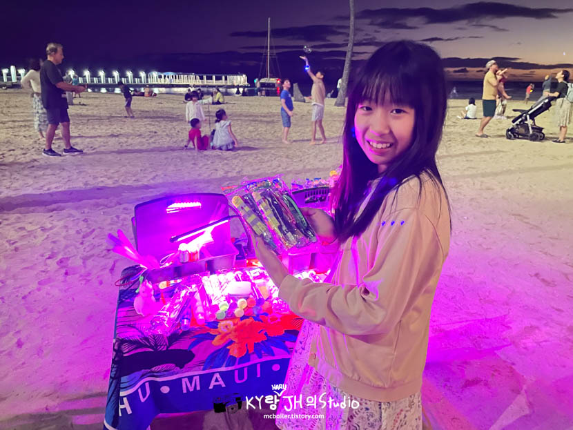 밤에는 저녁을 먹으러 가려고 해변가를 걷고 있을 때 사람들이 다들 뭔가 빛나는 걸 날리고 있었습니다. 뭔지 몰라서 궁금했는데 노점 자판에서 팔고 있는 장난감이었습니다. 하루도 사고 싶다고 해서 노점에서 팔고 있는 사람과의 교섭의 결과 5개를 20달러에 샀습니다. 처음에는 1개에 6달러?라고 했었기에 꽤 가격을 깎아 줬습니다 (색깔이 계속 변하는 레어템도 하나 끼워 줬습니다)