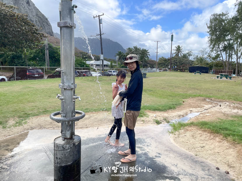 추워서 1시간도 안되어서 종료. 모래로 뒤덮여서 물로 씻어내고 싶은데 온수가 안 나오는 샤워... 하와이의 공용 샤워는 차가웠다...