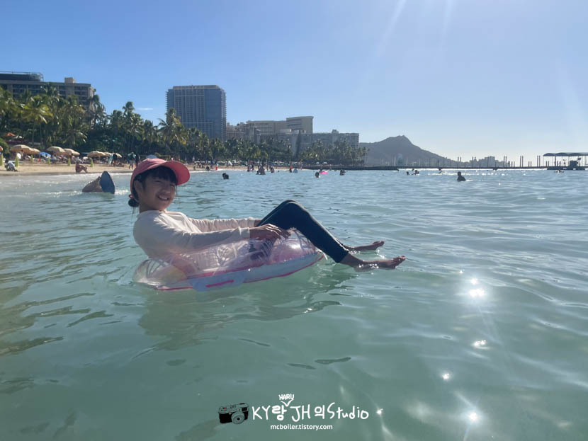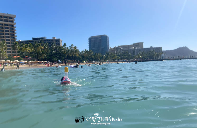 역시나 투명도가 별로 높지 않은 와이키키 비치. 그래도 평범히 수영하기에는 충분히 이뻤습니다!