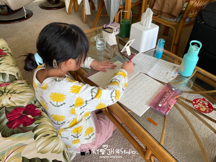 호텔에 돌아와서는 겨울 방학 숙제! 여기에서도 해 두지 않으면 개학 전에 못 끝내니까~