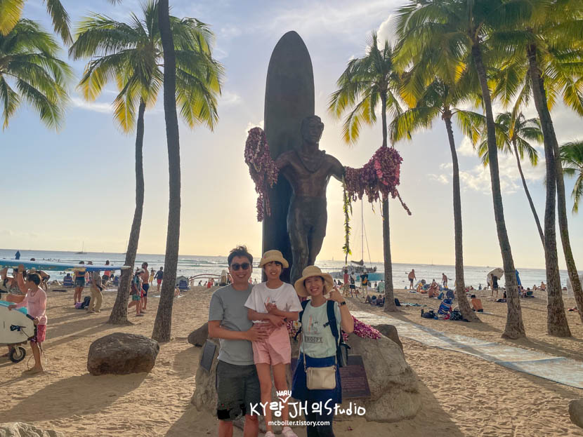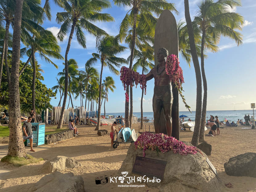 유명한 듀크 카하나모쿠 동상 앞에서 하차