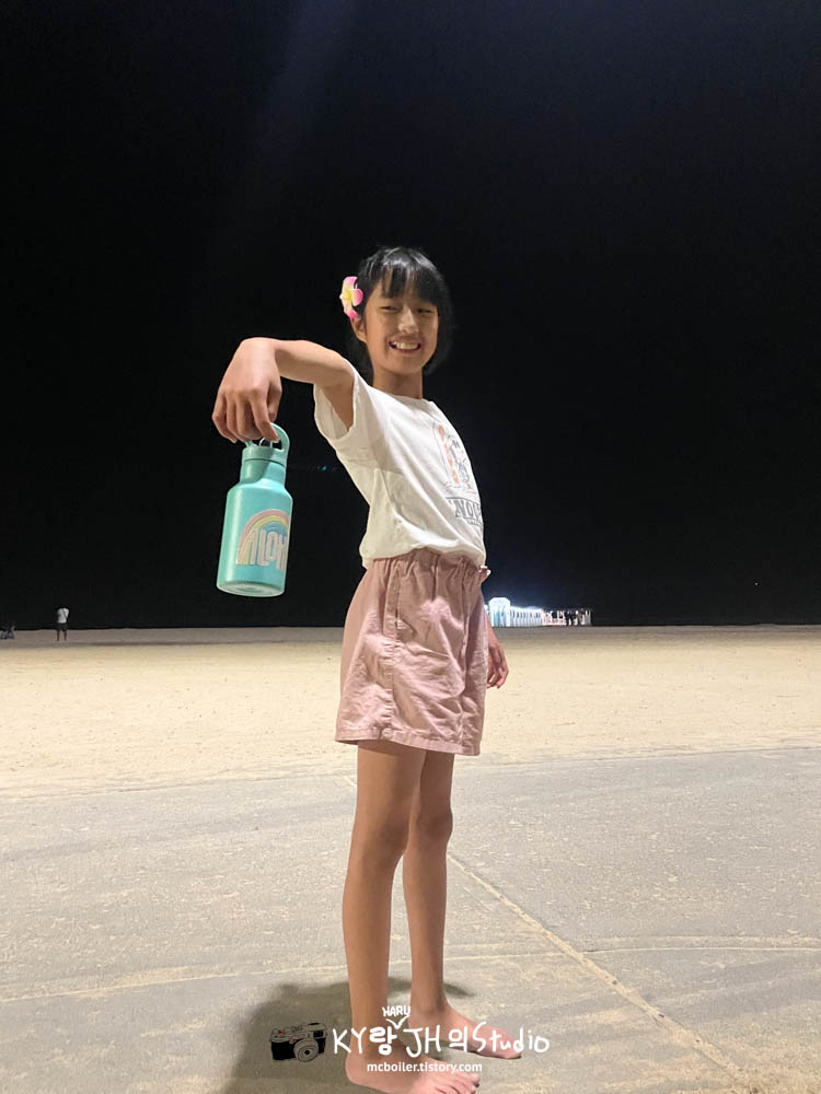 하지만 해변가를 따라 호텔로 돌아가는 길에 그 빛나는 장난감을 날리고 싶다고 하더니 조금 전까지의 졸림은 온데간데없고... 뛰어다니기 시작했습니다.