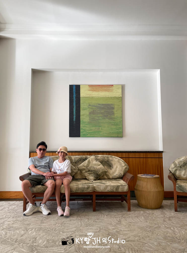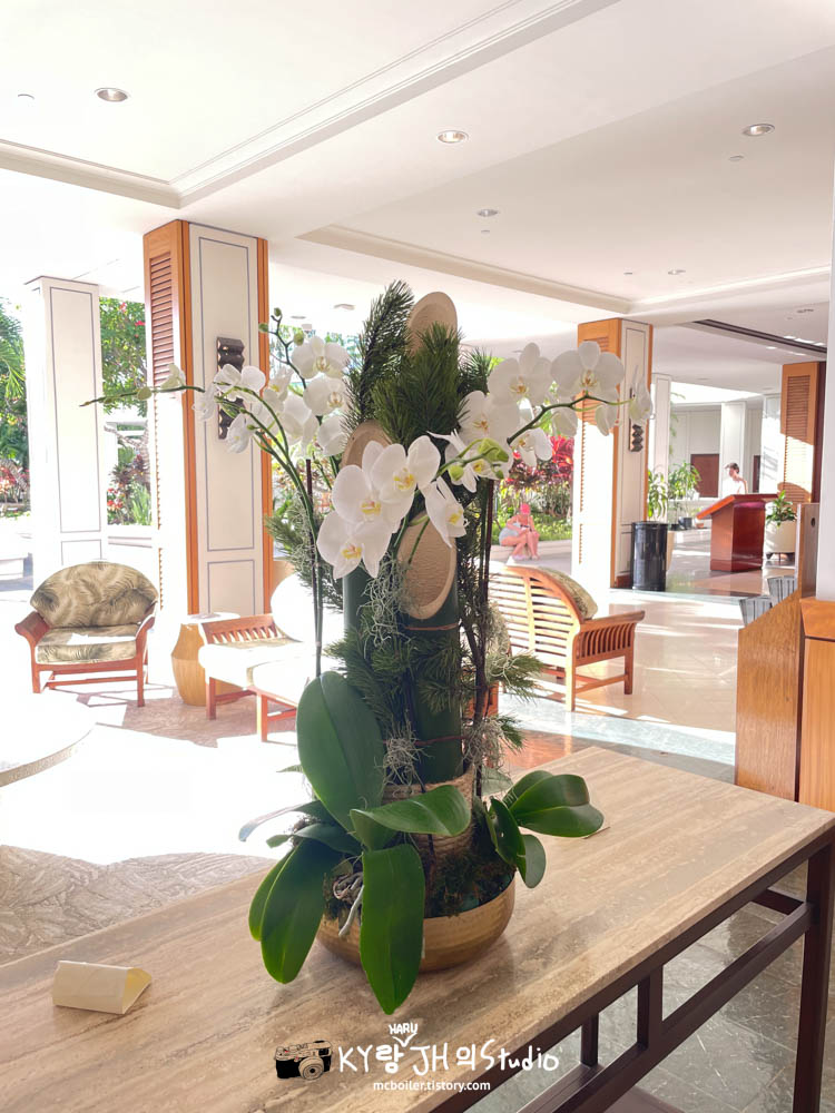 2024년 1월 2일 오후, 와이키키 중심부에 가서 산책을 하고 저녁도 먹고 오려고 호텔을 나섰습니다. 핑크 라인이 오는 시간까지 호텔 로비에서 기다렸습니다. 차분한 분위기의 로비가 좋았습니다♡